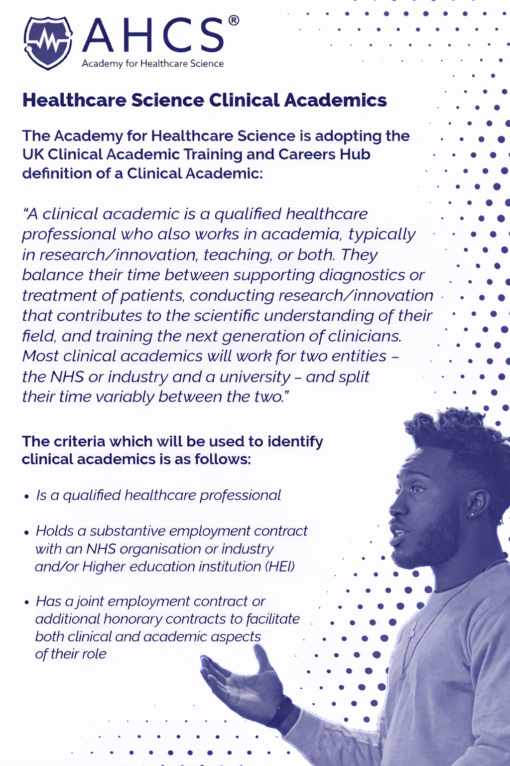 AHCS Adopt UK Clinical Academic Training and Careers Hub definition of a Clinical Academic